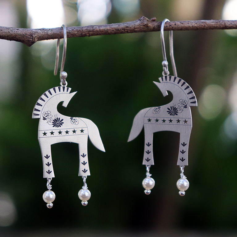 Brinco em prata com estampa vazada e oxidação em cor preta.