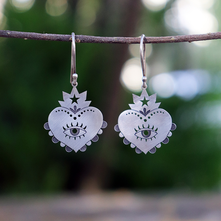 Brinco coração em prata com estampa de olho finalizado com gancho de prata.