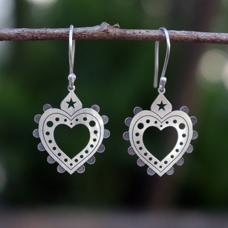 Brinco coração em prata com estampa finalizado com gancho de prata.