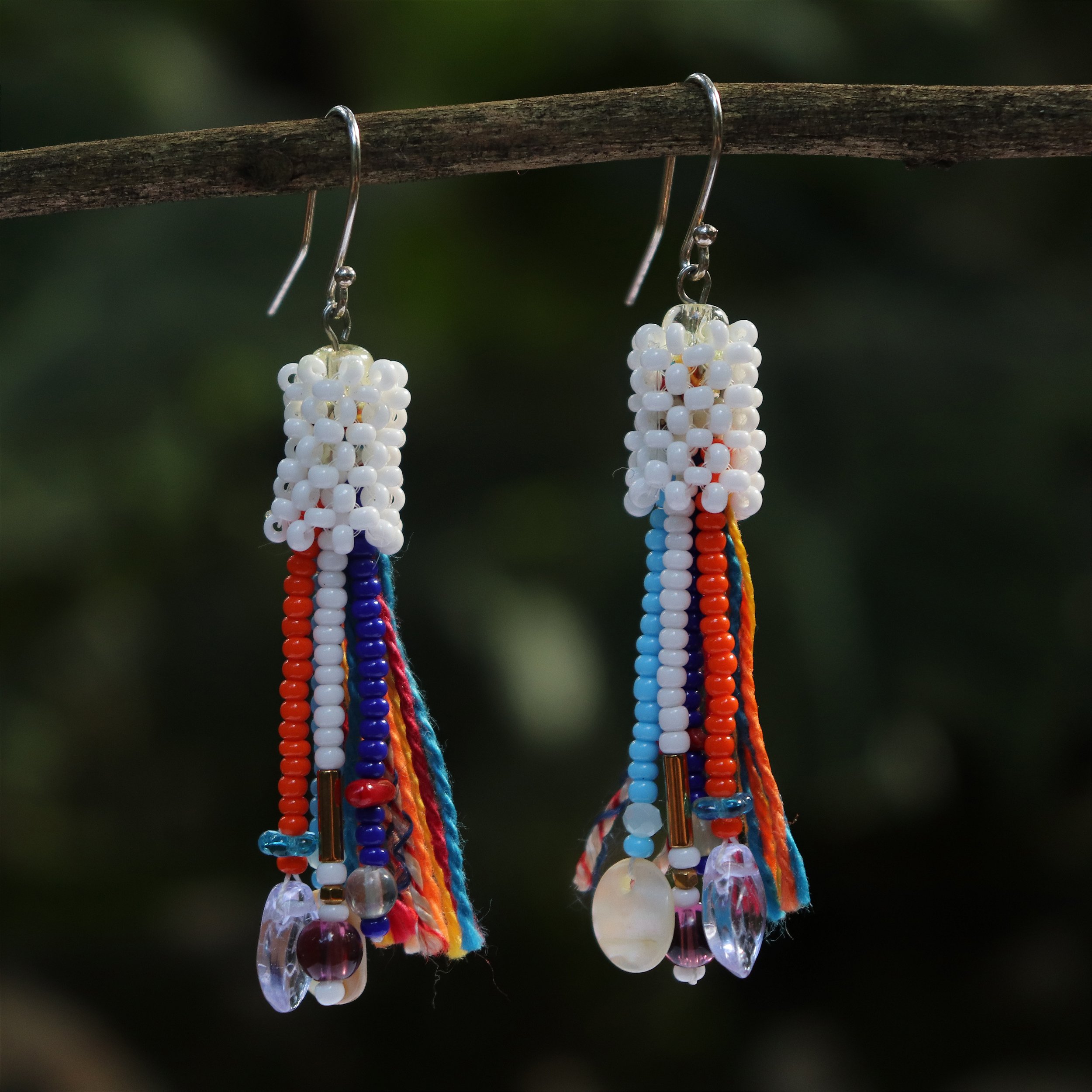 Brinco com miçangas, linhas de algodão e pingentes de murano italiano. Gancho em prata 850.