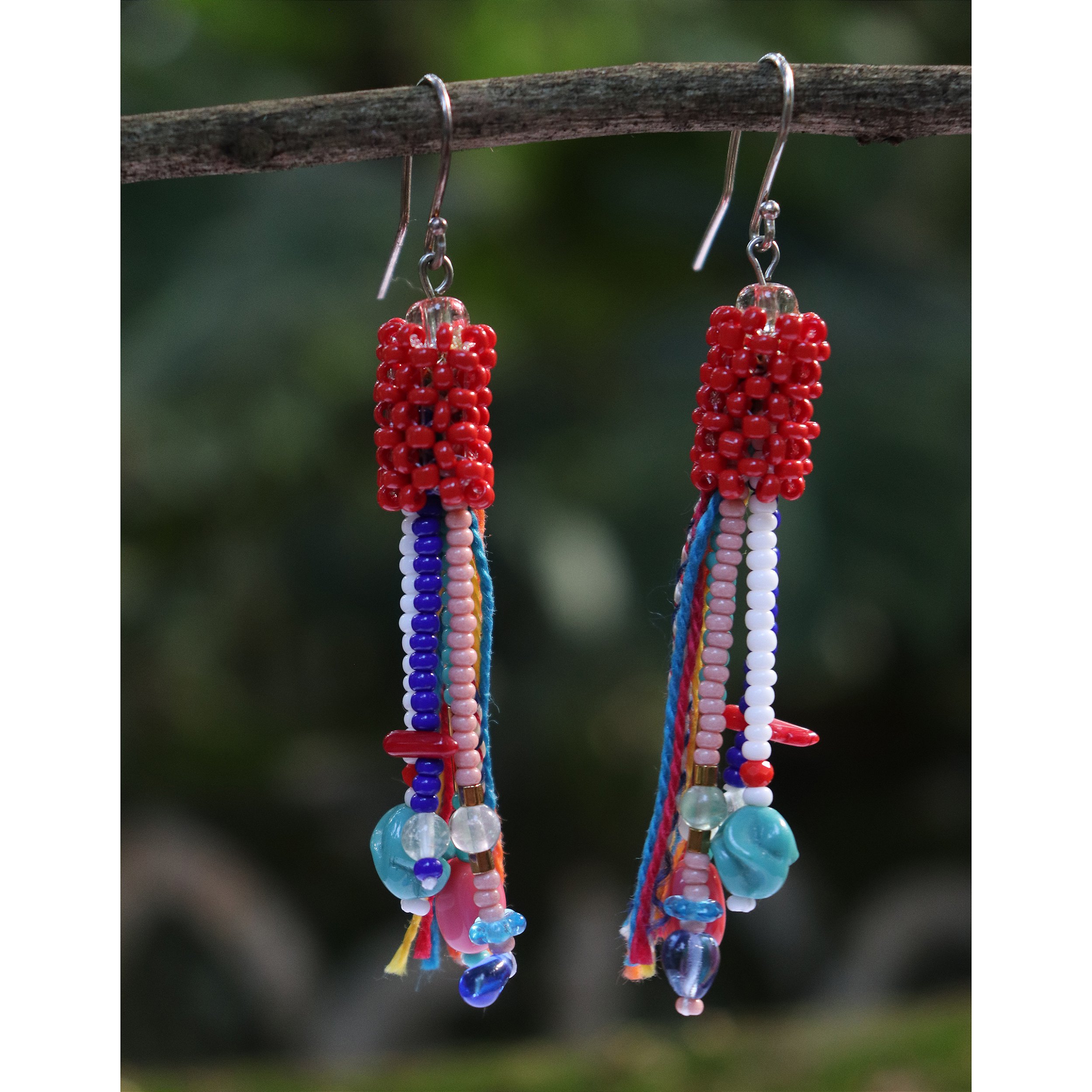 Brinco com miçangas, linhas de algodão e pingentes de murano italiano. Gancho em prata 850.