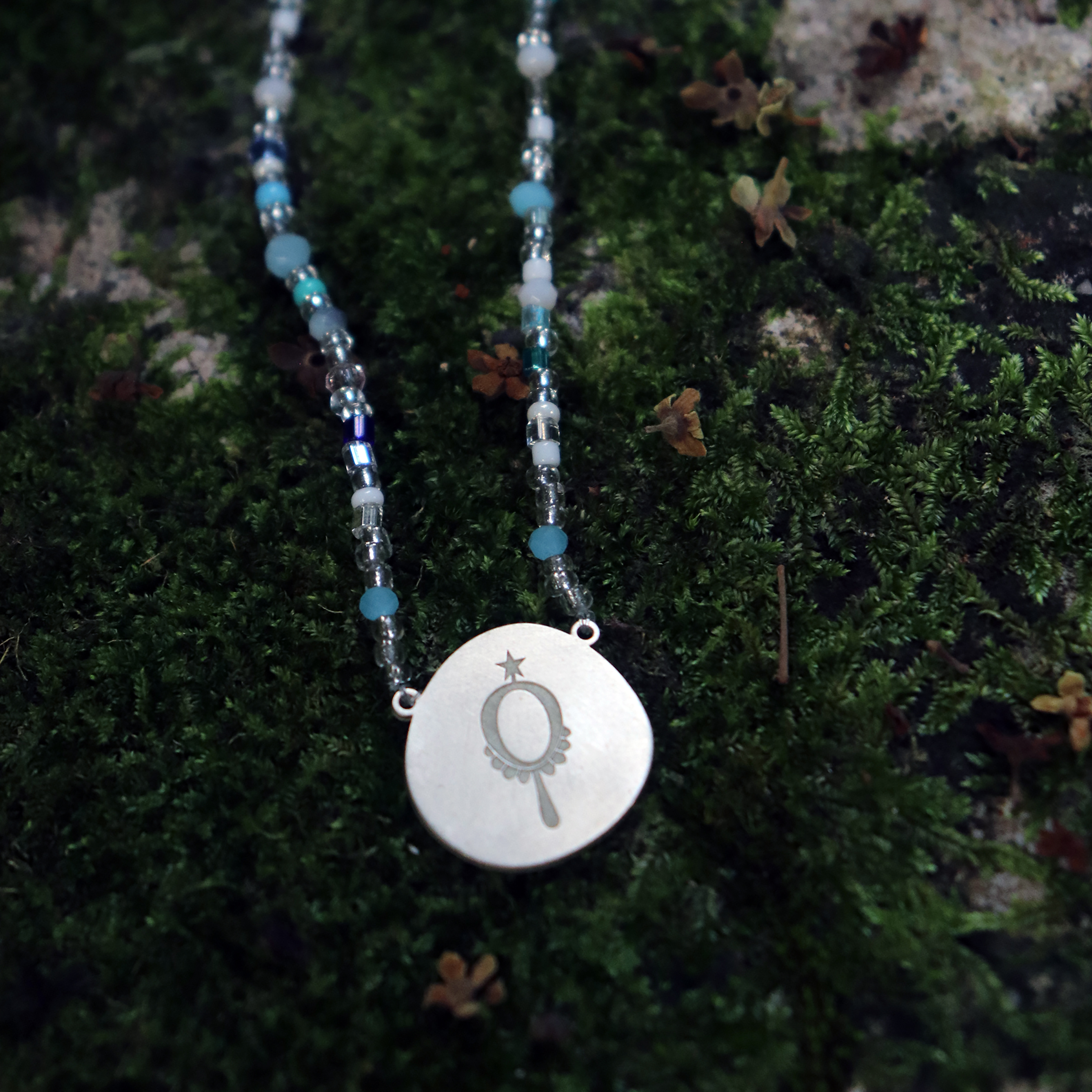 Colar com contas de pedras brasileras e miçanga nas cores de yemanjá, rainha dos mares.