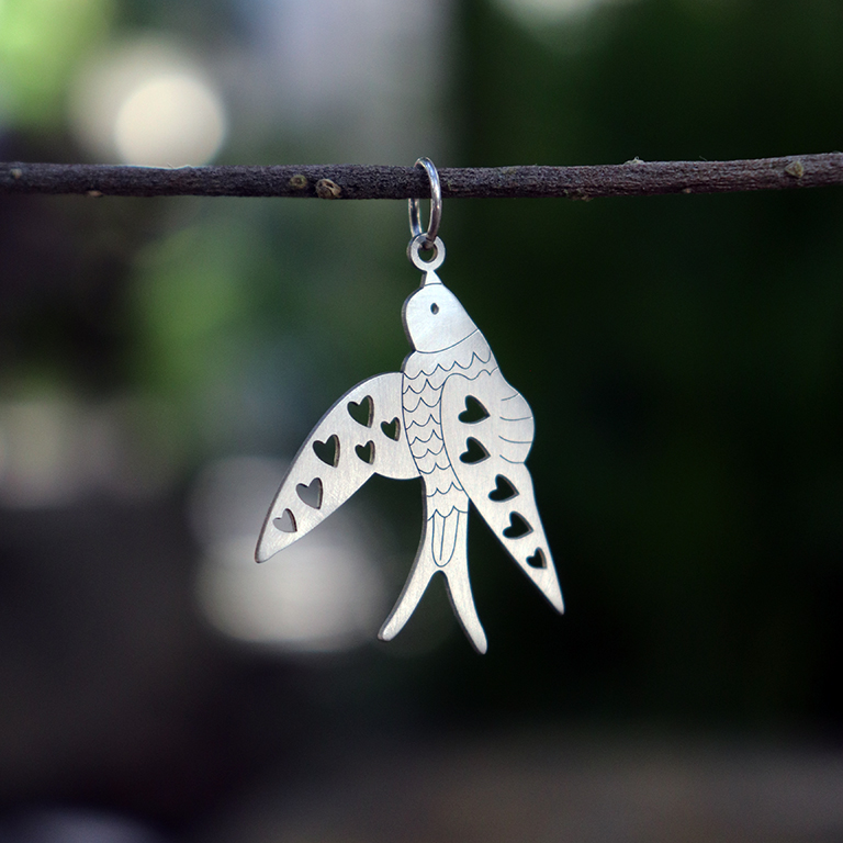 Pingente pássaro em prata com estampa vazada, finalizado com argola de 5mm .