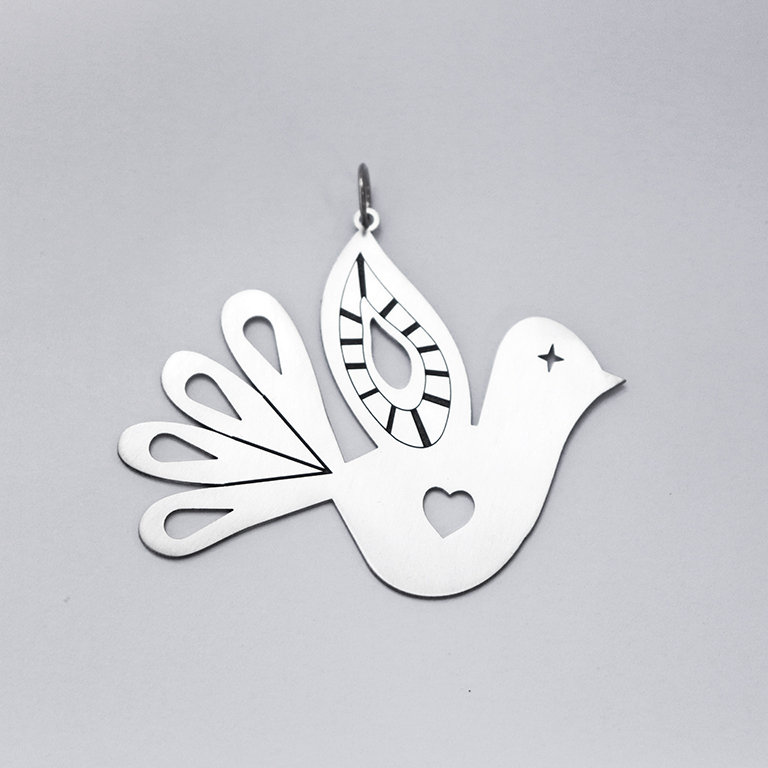 Pingente pombinha em prata com estampa finalizado com argola de 5mm .