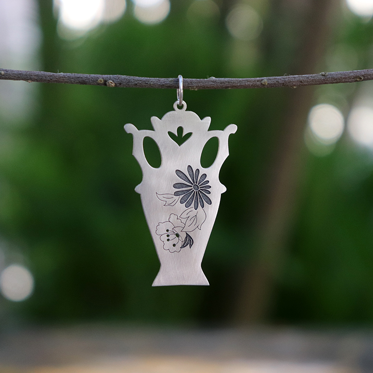 Pingente vaso floral em prata, com estampa finalizado com argola de 5mm .